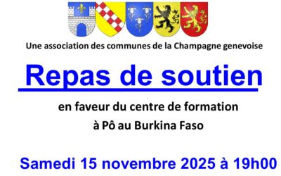 Une association des communes de la Champagne genevoise Repas de soutien en faveur du centre de formation à Pô au Burkina Faso Samedi 15 novembre 2025 à 19h00 Salle polyvalente d’Athenaz 35 Route d’Athenaz 1285 Athenaz—Bus L Film et photos de l’école - Stands...